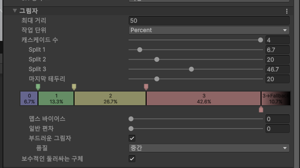 - 분석 : 이 경우, 기본값으로 설정된 편차가 오히려 불필요한 문제를 일으키고 있었음을 의미합니다. 편차를 0으로 설정하여 그림자 계산을 물체 표면에 더 가깝게 수행함으로써, 자기 그림자를 유발하던 정밀도 오류를 회피하고 깨끗한 결과를 얻게 된 것입니다. (물론, 다른 환경에서는 0으로 설정 시 오히려 Shadow Acne가 발생할 수도 있습니다.)